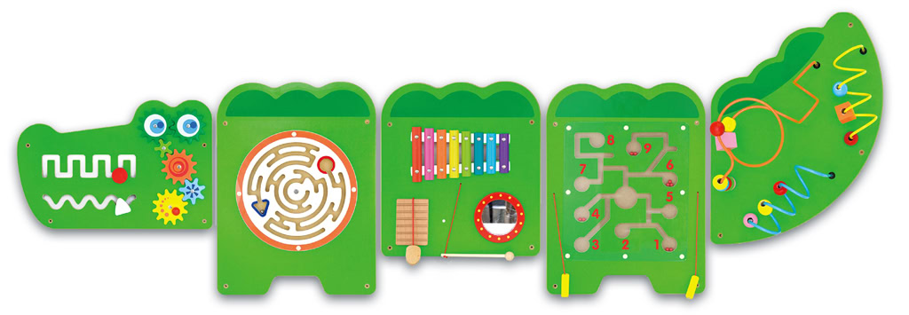 Dit wandspeelbord is multifunctioneel en uitstekend geschikt voor wachtruimtes en kinderopvang. Het bestaat uit 5 delen die eenvoudig tegen een wand of muur geschroefd kunnen worden. De complete krokodil heeft 8 verschillende speelfuncties, van links naar rechts: