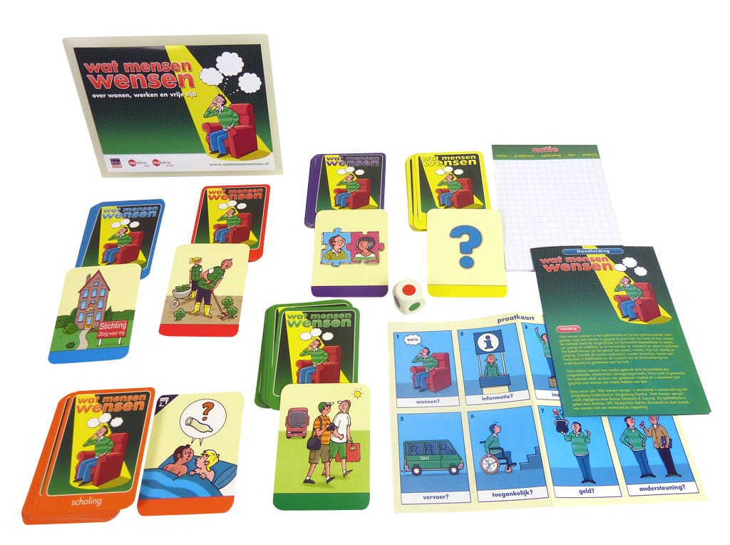 Wat Mensen Wensen is een eenvoudige en efficiënte spelmethode, handig voor iedereen die het belangrijk vindt om de wensen en knelpunten van ‘zijn mensen’ te kennen en hen daarin te ondersteunen. Met Wat Mensen Wensen kun je op een speelse, maar gestructureerde manier leefsituaties met cliënten bespreken. De thema’s zijn: wonen, werken, vrije tijd, relaties en scholing. De speelse methode werkt op basis van getekende situaties en is daardoor ook zeer geschikt voor mensen die moeite hebben met taal.