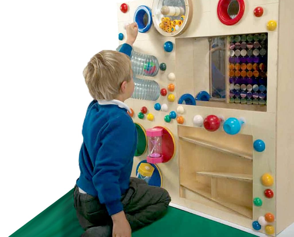 Deze wand van 90 x 100 x 18 cm biedt allerlei leuke zwaartekracht avonturen! Drie gekleurde zandlopers die kunnen worden gedraaid, een spiegelknikkerwiel en twee ballenbuizen (voor ballen met diameter van 7 cm) en nog veel meer moois garanderen veel speelplezier.