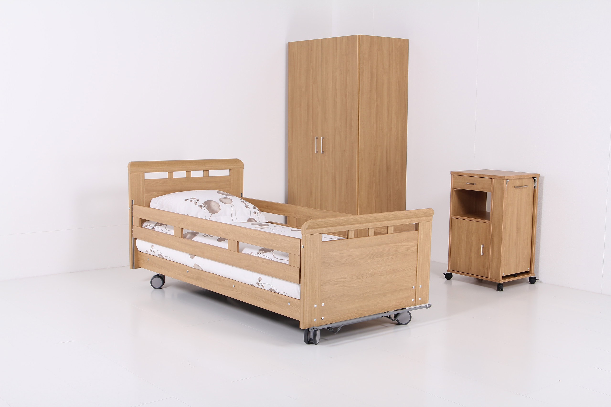 Dit ‘All-in-one’ verpleegbed voldoet aan alle eisen op het gebied van comfort en ergonomie van een modern zorgbed. het is verkrijgbaar in verschillende, aansprekende houtdecoren. Het zorgbed Elbacare is bijzonder geschikt voor gebruik in verpleeghuizen, maar kan uiteraard ook uitstekend in een huiselijke omgeving worden toegepast.Het bed heeft een 4-delig, stalen ligvlak van 90 x 200 cm met matrasbeugels aan het hoofd- en voeteneinde. Elektrische verstelbare rugleuning tot 70º en bovenbeenverstelling tot 30º. Onderbeenondersteuning mechanisch instelbaar in 5 standen. Daarnaast is het bed voorzien van een nood-daalfunctie via 9 volt batterij, in geval van een stroomstoring. Draaggewicht tot 185 kg, veilige werkbelasting tot 220 kg.